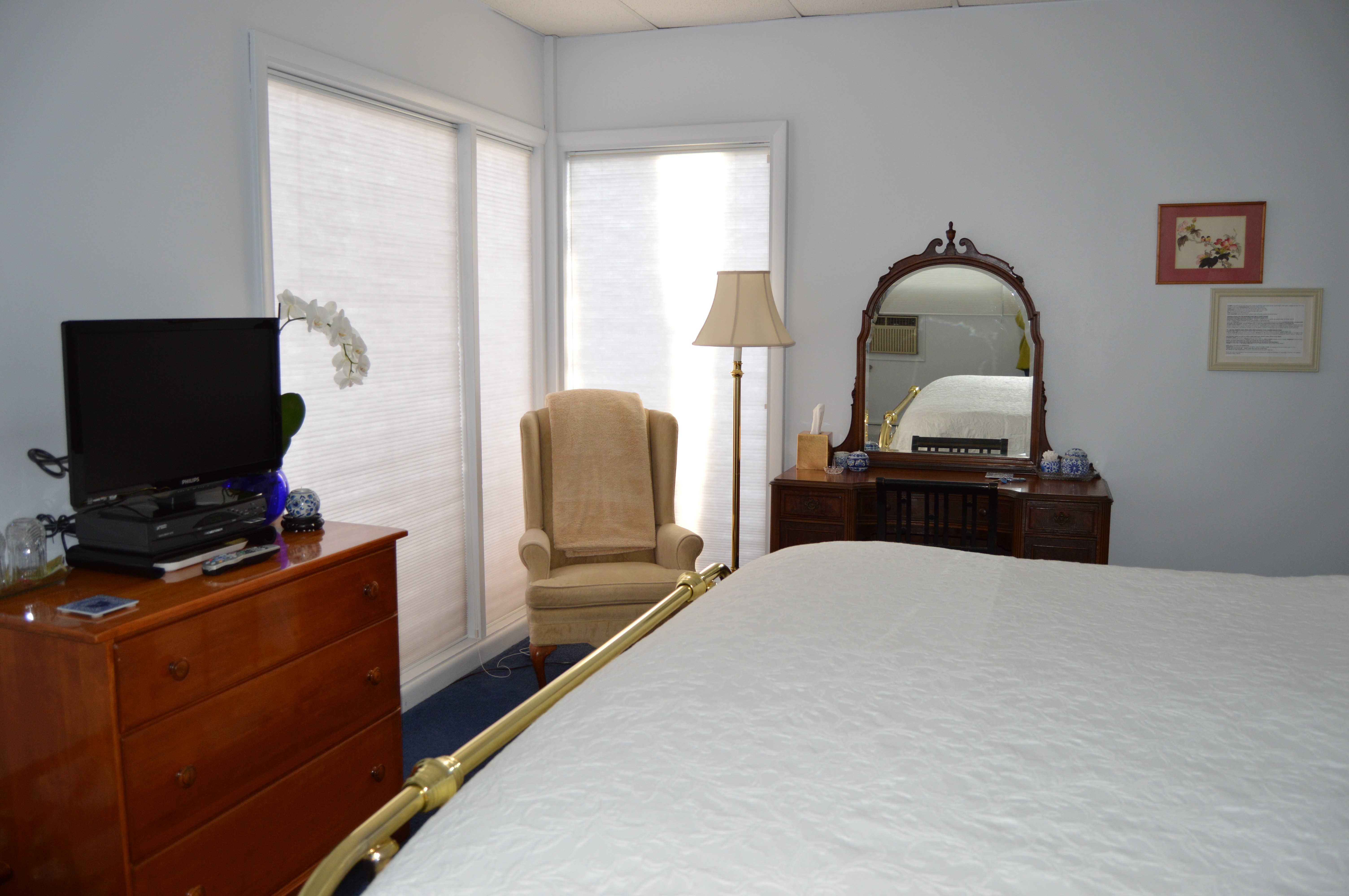 There is an antique dressing table, dresser with 26″ flat screen TV, chair with reading lamp and a walk-in closet with a small refrigerator.